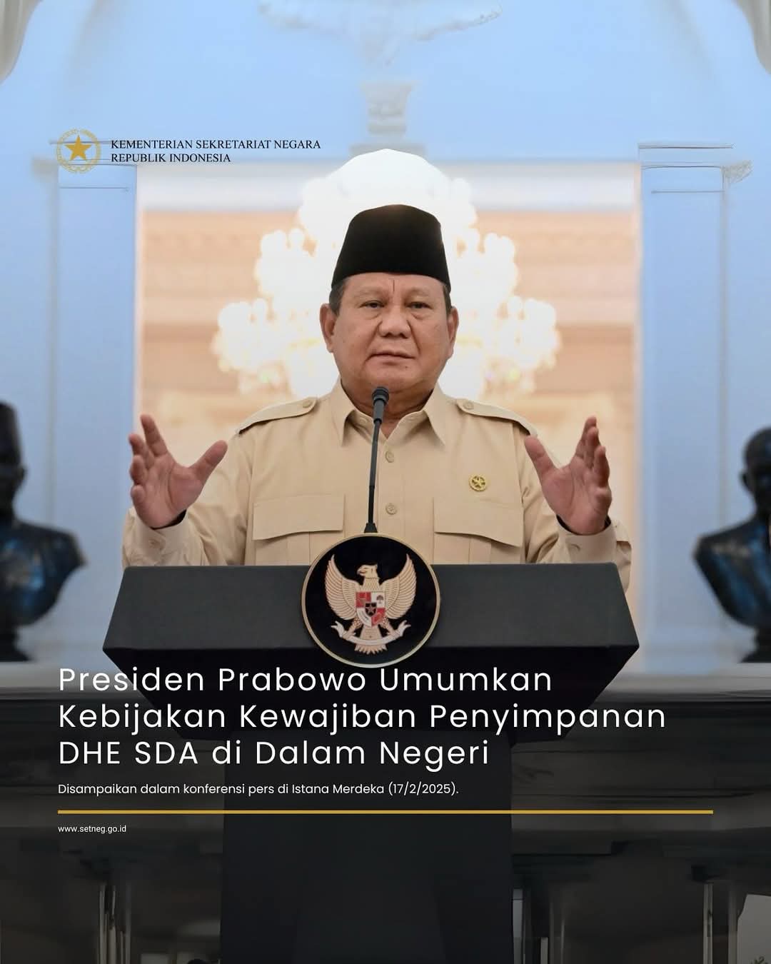 Suararakyat.info.Jakarta – Presiden Prabowo Subianto mengumumkan serangkaian kebijakan strategis guna menjaga stabilitas dan meningkatkan daya beli masyarakat dalam rangka mendorong pertumbuhan ekonomi nasional. Dalam konferensi pers yang digelar di Istana Merdeka, Jakarta, Senin (17/2/2025), Presiden menegaskan pentingnya kebijakan terkait kewajiban menyimpan Devisa Hasil Ekspor Sumber Daya Alam (DHE SDA) di dalam negeri.