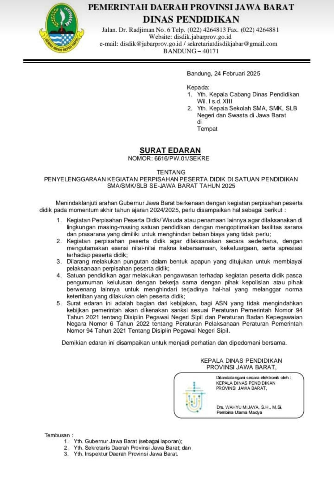 Suararakyat.info.Sukabumi-Surat ini berisi ketentuan penyelenggaraan kegiatan perpisahan peserta didik di tingkat SMA/SMK/SLB se-Jawa Barat untuk tahun ajaran 2024/2025, sesuai arahan Gubernur Jawa Barat.