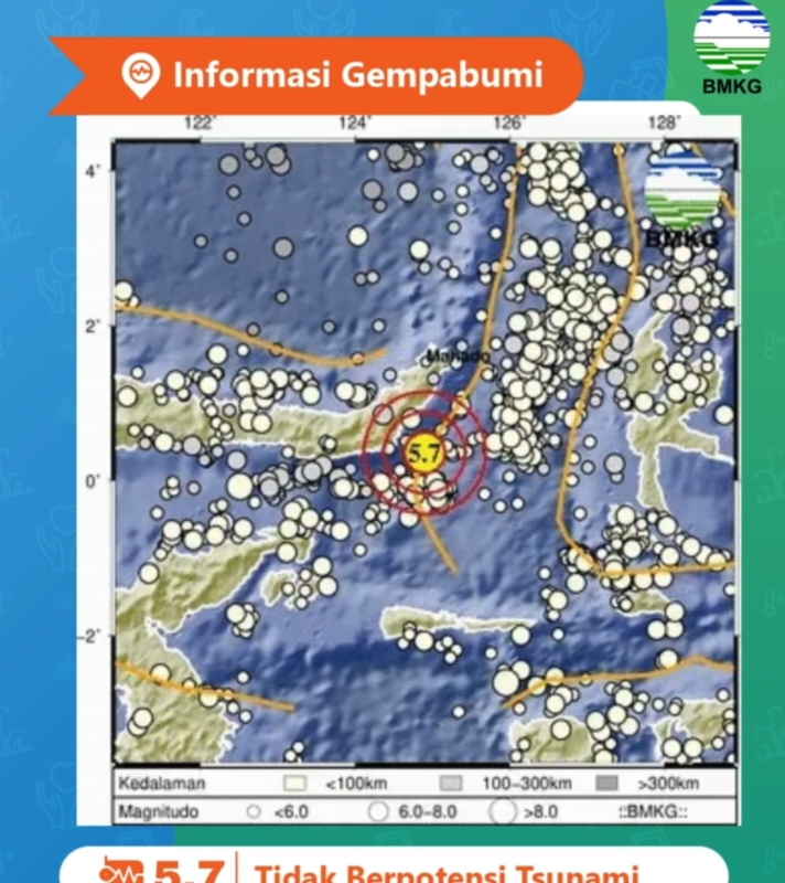 Suararakyat.info.Sulut-Badan Meteorologi, Klimatologi, dan Geofisika (BMKG) melaporkan telah terjadi gempa bumi dengan magnitudo 5,7 yang mengguncang wilayah tenggara Tutuyan, Kabupaten Bolaang Mongondow Timur (Boltim), Provinsi Sulawesi Utara, pada Kamis pagi, 17 April 2025.