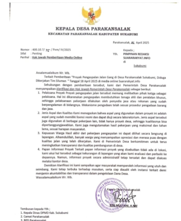 Suararakyat.info.Sukabumi-Terkait Pemberitaan “Proyek Pengaspalan Jalan Gang di Desa Parakansalak Sukabumi, Diduga Dikerjakan Tim Siluman” Tanggal 18 April 2025 di media online Suararakyat.info