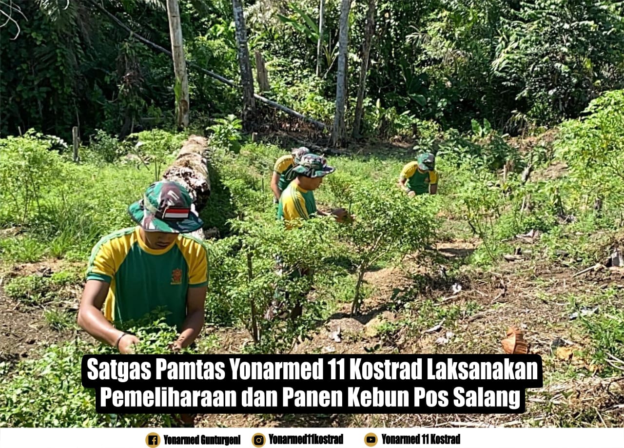 Suararakyat.info.Nunukan-Guna menjaga ketahanan pangan pos sekaligus berkontribusi terhadap kebutuhan sayur mayur di wilayah perbatasan, Satgas Pamtas RI–Malaysia Yonarmed 11 Kostrad melaksanakan kegiatan pemeliharaan tanah, perawatan tanaman, dan panen di kebun Pos Salang yang berada di Desa Salang, Kecamatan Tulin Onsoi, Kabupaten Nunukan.(26/4/2025)