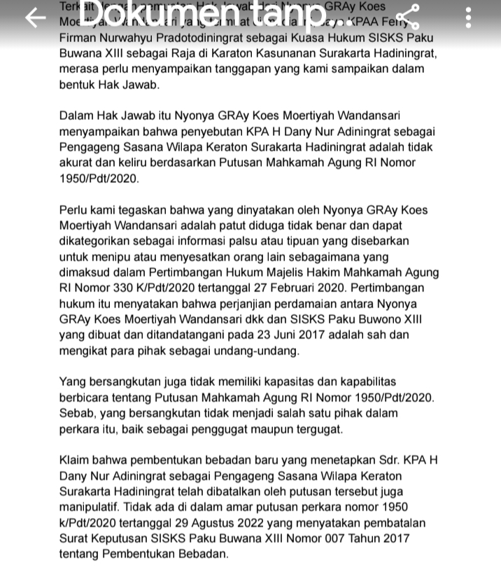 “Dengan demikian, SK lama yang diklaim masih berlaku oleh GRAy Koes Moertiyah sudah tidak lagi memiliki kekuatan hukum,” jelas Firman. Ia juga membantah adanya amar putusan dari MA Nomor 1950 K/Pdt/2020 yang menyatakan pembatalan Surat Keputusan SISKS PB XIII Nomor 007 Tahun 2017 yang menetapkan KPA H. Dany Nur Adiningrat sebagai pejabat Pengageng Sasana Wilapa.