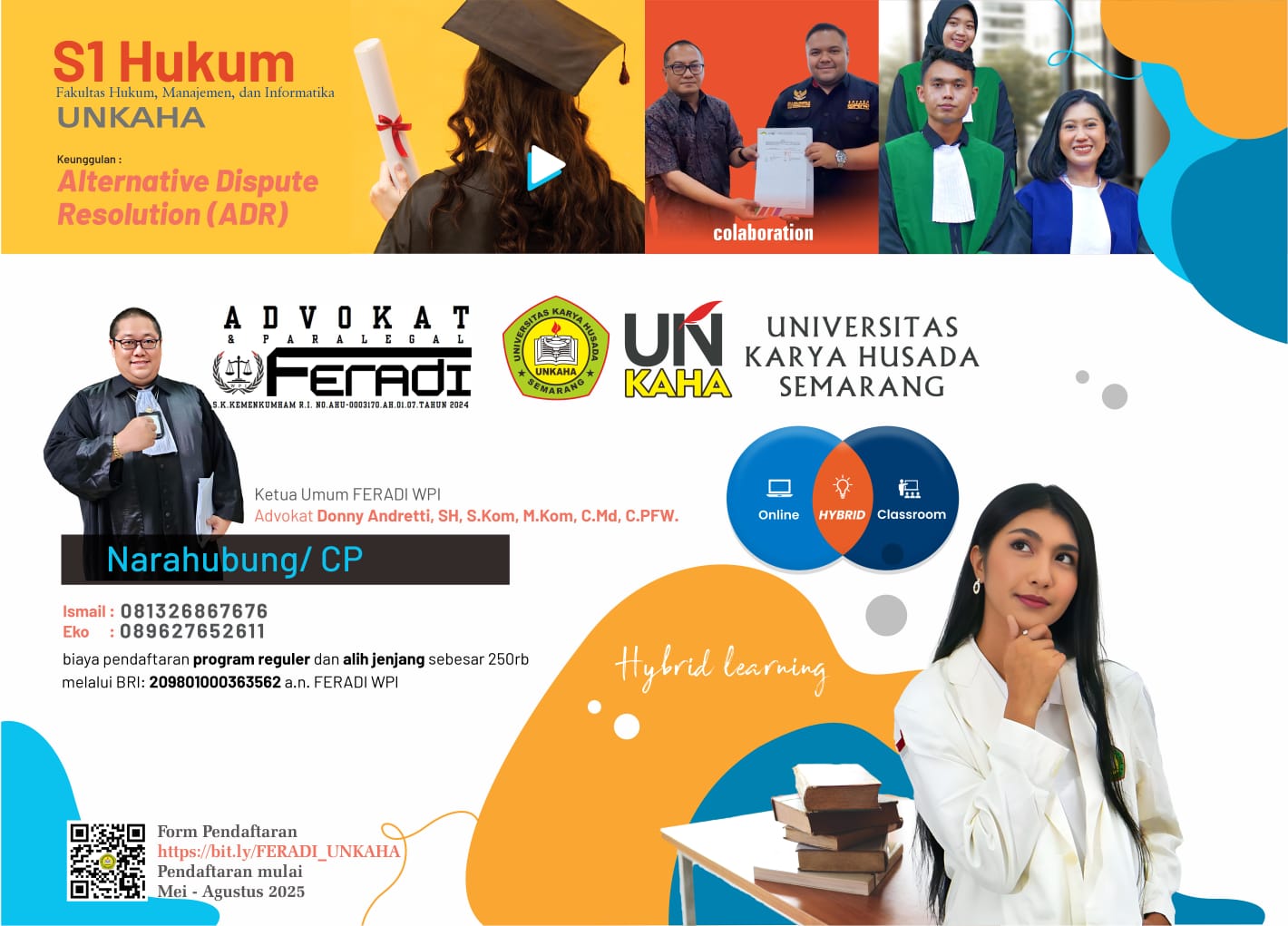 Suararakyat.info.Semarang-Universitas Karya Husada Semarang (UNKAHA) terus menunjukkan komitmennya dalam mencetak generasi hukum yang tak hanya cakap secara akademis, tetapi juga kuat secara etika dan praktik. Melalui Program Studi S1 Hukum di bawah Fakultas Hukum, Manajemen, dan Informatika, UNKAHA kini menjalin kemitraan strategis dengan Forum Edukasi dan Advokasi Indonesia Wilayah Pengembangan Integratif (FERADI WPI) untuk menghadirkan dua program unggulan: Pendidikan Profesi Hukum dan Pusat Bantuan Hukum yang menyasar mahasiswa serta masyarakat umum.Kamis (8/5/2025)