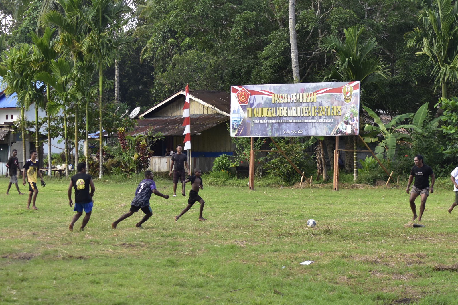 Yeflio – Seharian kegiatan terfokus pada sasaran fisik bangunan, namun tidak melupakan untuk tetap olah raga, seperti Anggota Satgas TMMD Ke-124 Kodim 1802/Sorong Kopda Dani berbaur dengan masyarakat untuk bermain sepak bola yang lapangan bola berada di Lokasi TMMD Ke-124 Kampung yeflio distrik mayamuk kabupaten sorong. Provinsi Papua Barat Daya. Senin (12/05/25).