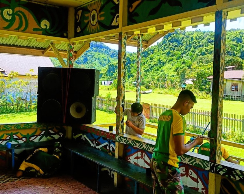 Suararakyat.info.Nunukan– Dalam upaya menciptakan hubungan yang harmonis dan menjalin tali silaturahmi dengan masyarakat di perbatasan, Satgas Pamtas Yonarmed 11 Kostrad Pos Lumbis turut serta membantu pengecatan dan perawatan Balai Adat di Desa Tuntulibing, Kecamatan Lumbis Hulu, Kabupaten Nunukan, Kalimantan Utara.