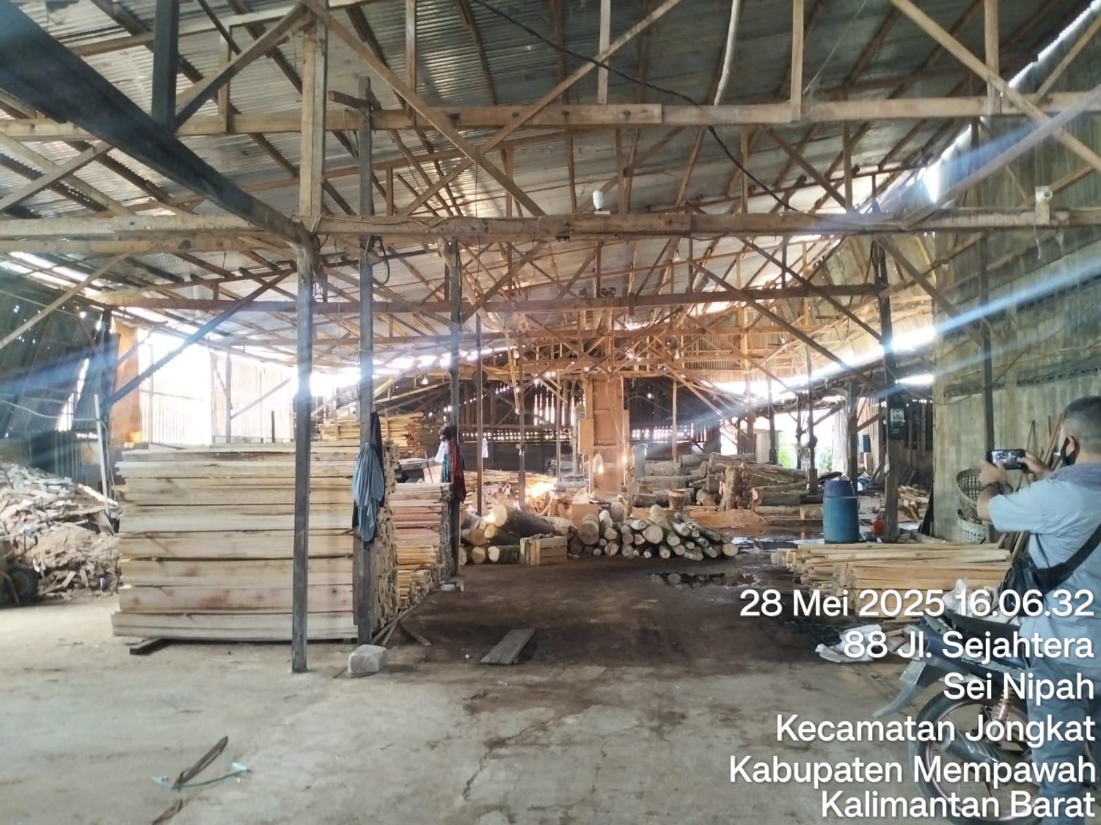 Pantauan tim di lapangan menunjukkan bahwa lokasi gudang tidak memasang papan nama atau informasi izin usaha sebagaimana diatur dalam peraturan daerah. Gudang berada di lingkungan permukiman padat penduduk, dan aktivitas pemotongan kayu terpantau berpotensi menimbulkan pencemaran udara berupa serbuk kayu dan kebisingan mesin.