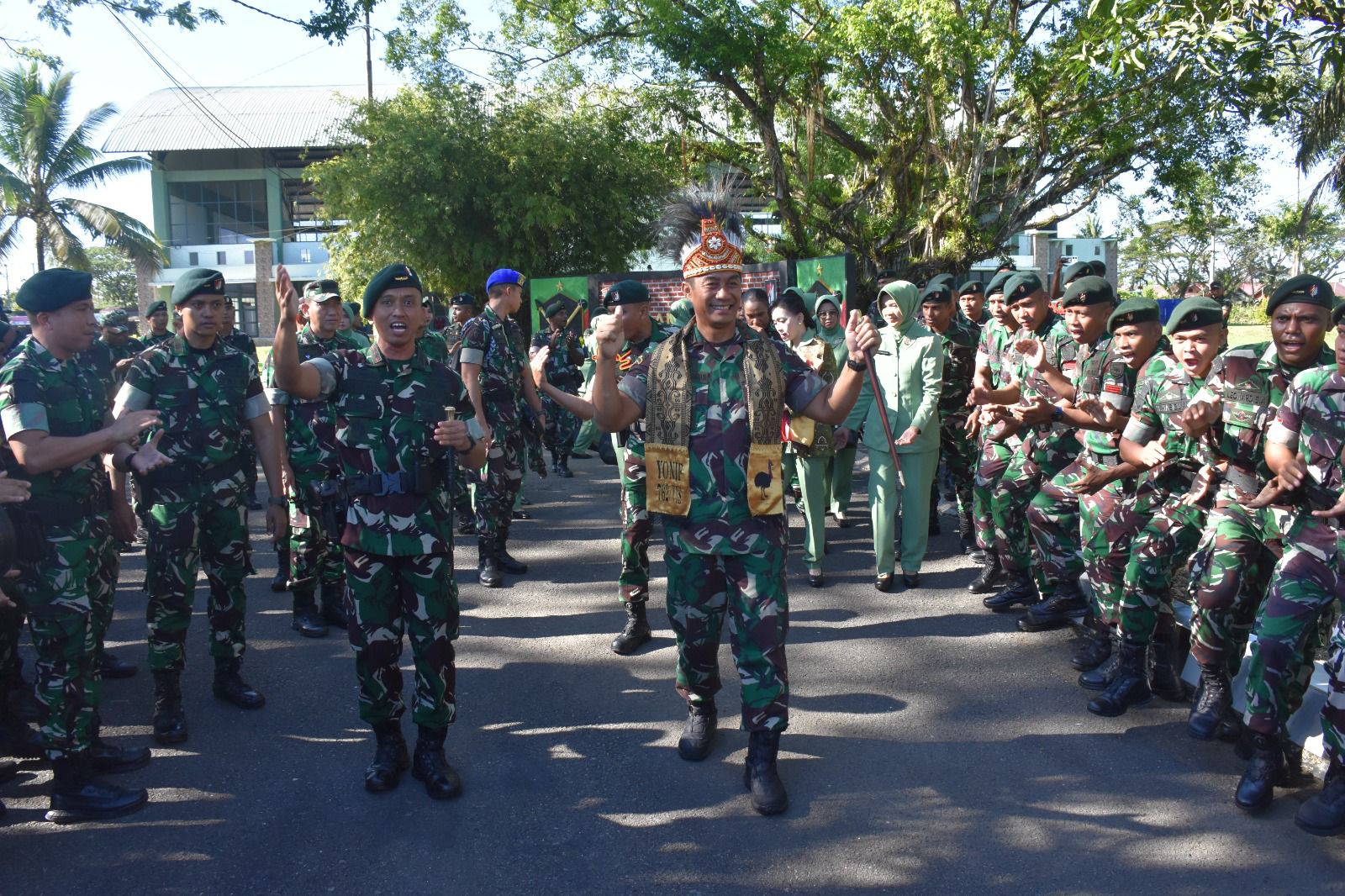 Kunjungan kerja tersebut di dampingi oleh Ketua Persit Kartika Chandra Kirana Daerah XVIII/Kasuari, Ny. Arlin Jimmy Ramoz, Pangdam disambut dengan penuh kehormatan secara militer oleh prajurit Yonif 762/VYS dan menerima laporan satuan dari Danyonif 762/VYS Letkol Inf Dwi Haryanto, S.Hub.Int., M.H.I.. Tradisi penyambutan juga turut dimeriahkan oleh penampilan tarian khas Papua “Yospan” oleh prajurit dan ibu-ibu Persit Ranting 2 Yonif 762/VYS.