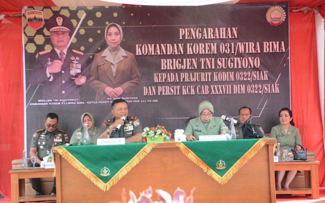 Tiba di Makodim 0322/Siak, Brigjen TNI Sugiyono disambut hangat oleh Dandim 0322/Siak Letkol Arh Riyanto Budi Nugroho, M.Han Beserta jajaran perwira dan prajurit serta anggota Persit jajaran kodim 0322/Siak. Dalam arahannya, Danrem menekankan pentingnya menjaga kedisiplinan, kehormatan prajurit, serta peran aktif keluarga dalam mendukung tugas suami sebagai anggota TNI. Selain itu poin penting yang disampaikan meliputi Bahaya Narkoba, Larangan Judi Online dan Investasi Ilegal, Penolakan terhadap Kekerasan,Desersi dan THTI,Serta Peran Strategis Persit.