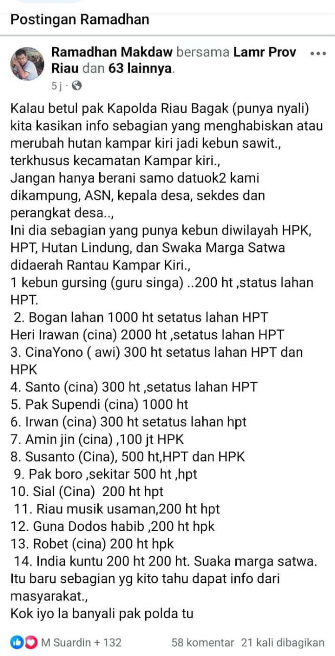 “Kalau betul Pak Kapolda Riau bagak (berani), kita kasikan info sebagian yang menghabiskan atau merubah hutan Kampar Kiri jadi kebun sawit,” tulis Ramadhan.(13/6/2025)