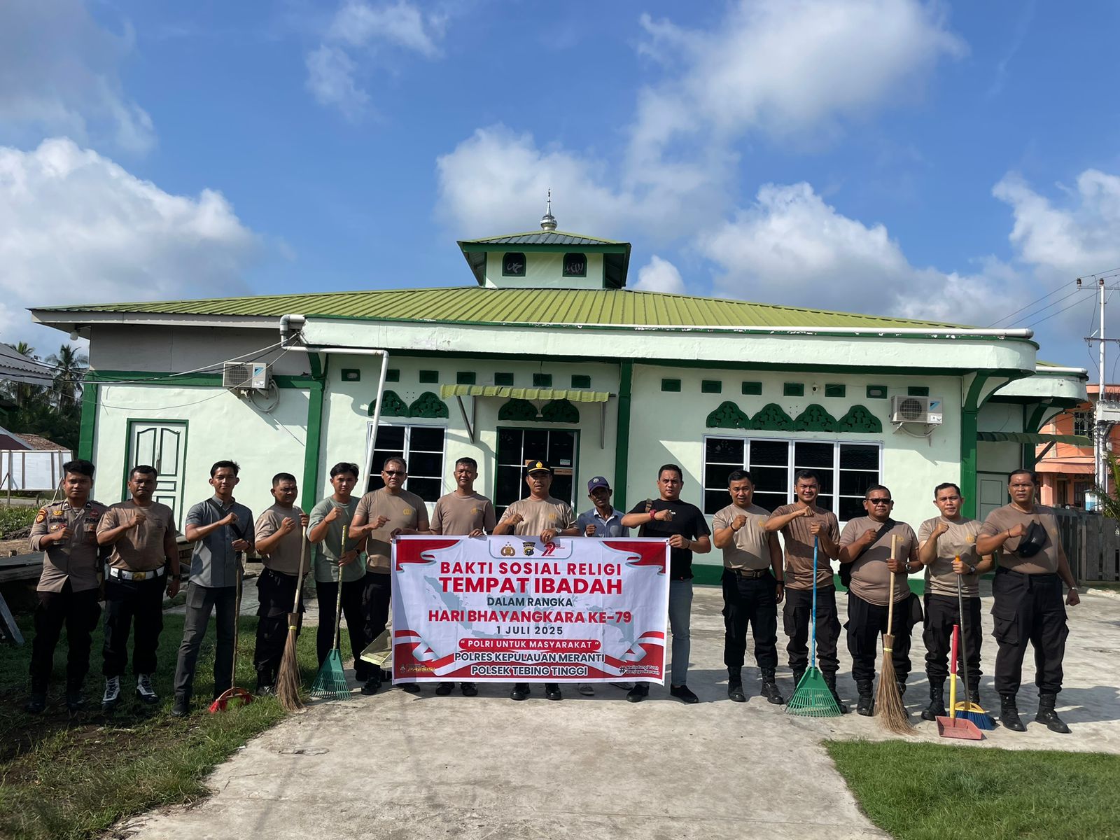 suararakyat.Info : MERANTI – Dalam rangka memperingati Hari Bhayangkara ke-79 tahun 2025, Polsek Tebingtinggi, Polres Kepulauan Meranti kembali menunjukkan komitmennya sebagai pelindung dan pengayom masyarakat melalui kegiatan Bakti Religi di rumah ibadah berbeda, Sabtu (21/06/2025) pagi.