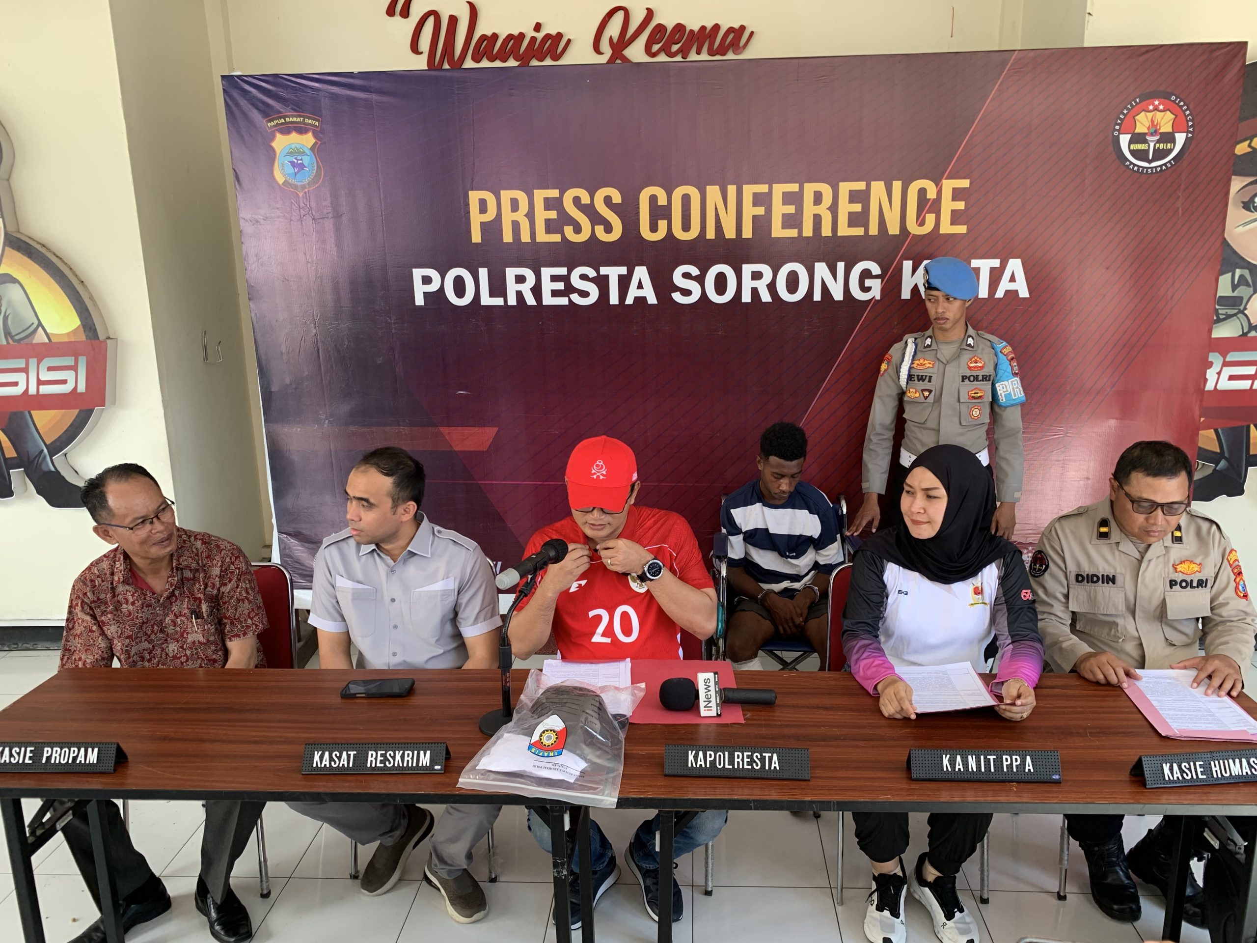 Kombespol Happy Perdana Yudianto, S.IK., M.H., selaku Kapolresta Sorong Kota, menggelar konferensi pers di markas Polresta di Jalan Ahmad Yani, Minggu (29/6/2025). Didampingi oleh sejumlah perwira penting seperti Kasat Reskrim, Kasi Propam, Kasi PPA, dan Kasi Humas, Kapolresta menyampaikan kronologi serta langkah-langkah cepat yang diambil oleh jajarannya.