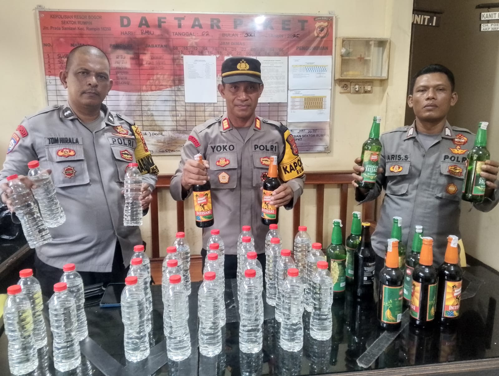 Barang bukti di amankan di Polsek Rumpin petugas menemukan adanya minuman keras,” terang AIPDA Tom Hilala Bhabinkamtibmas Desa Cipinang.