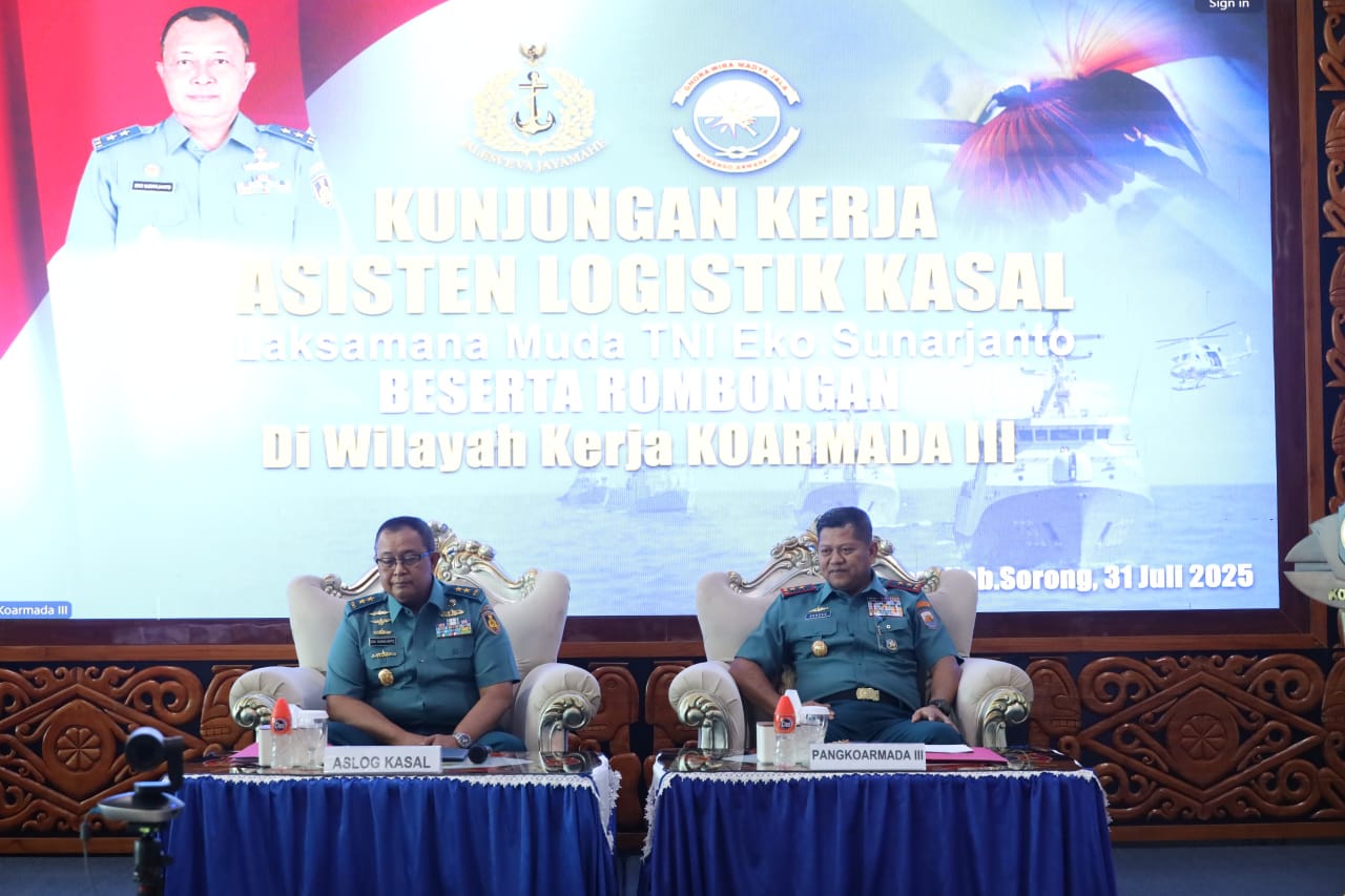Katapop, Kabupaten Sorong Papua Barat Daya, 31 Juli 2025 — Komando Armada III (Koarmada III) menerima kunjungan kerja dari Asisten Logistik (Aslog) Kepala Staf Angkatan Laut (Kasal) Laksamana Muda TNI Eko Sunarjanto di Markas Koarmada III, Katapop, Kabupaten Sorong. Turut hadir dalam rombongan, Kepala Dinas Perbekalan TNI AL (Kadisbekal) Laksamana Pertama TNI Dr. Hery Setiyo Nugroho, S.E., M.A.P., CHRMP., serta Kepala Dinas Material TNI AL (Kadismatal) Laksamana Pertama TNI Suryaman, S.T.
