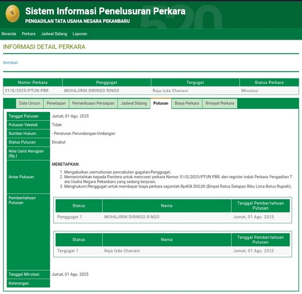 Hal ini diketahui setelah Putusan penetapannya dibacakan oleh Majelis Hakim pada tanggal 01 Agustus 2025, melalui Ecourt Pengadilan Tata Usaha Negara (PTUN) Pekanbaru dengan penetapannya No 31/G/2025/PTUN PBR, dengan tergugat Raja Izda Charani, Kepsek SMP Negeri 1 Pekanbaru.