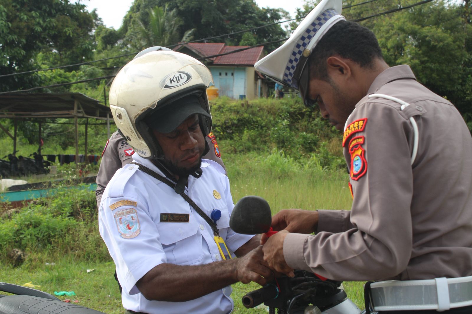 Selain membagikan bendera, personel Satlantas juga mengingatkan pengendara agar melengkapi surat-surat kendaraan dan selalu mengutamakan keselamatan dalam berlalu lintas.
