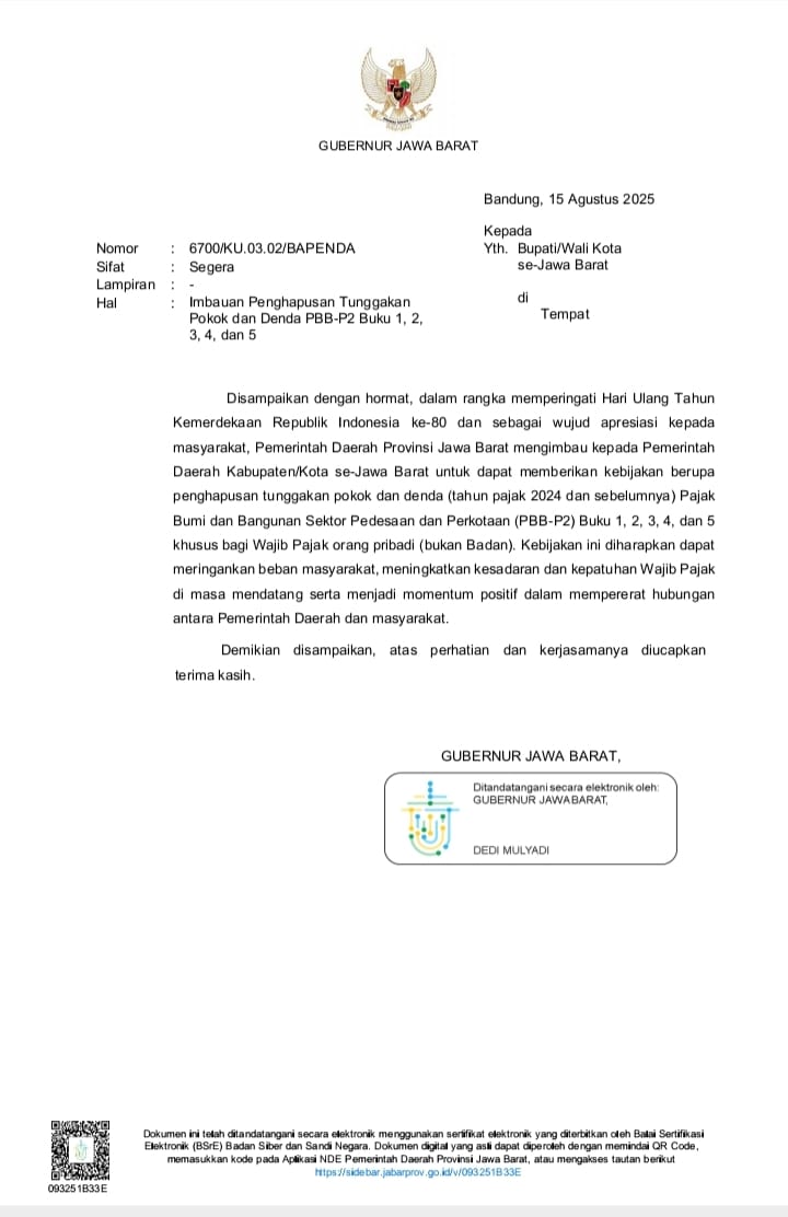 Menurut Asep, kebijakan penghapusan tunggakan PBB diberlakukan bagi warga dengan catatan kewajiban pajak dari tahun 2024 ke bawah. Langkah tersebut diambil lantaran kondisi ekonomi masyarakat saat ini masih terbilang sulit.