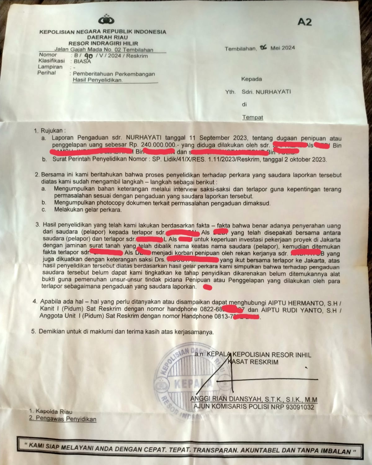 Kasus Penipuan Rp240 Juta Diduga Mangkrak Dua Tahun, Korban Nurhayati Tagih Kepastian Hukum dari Polres Inhil