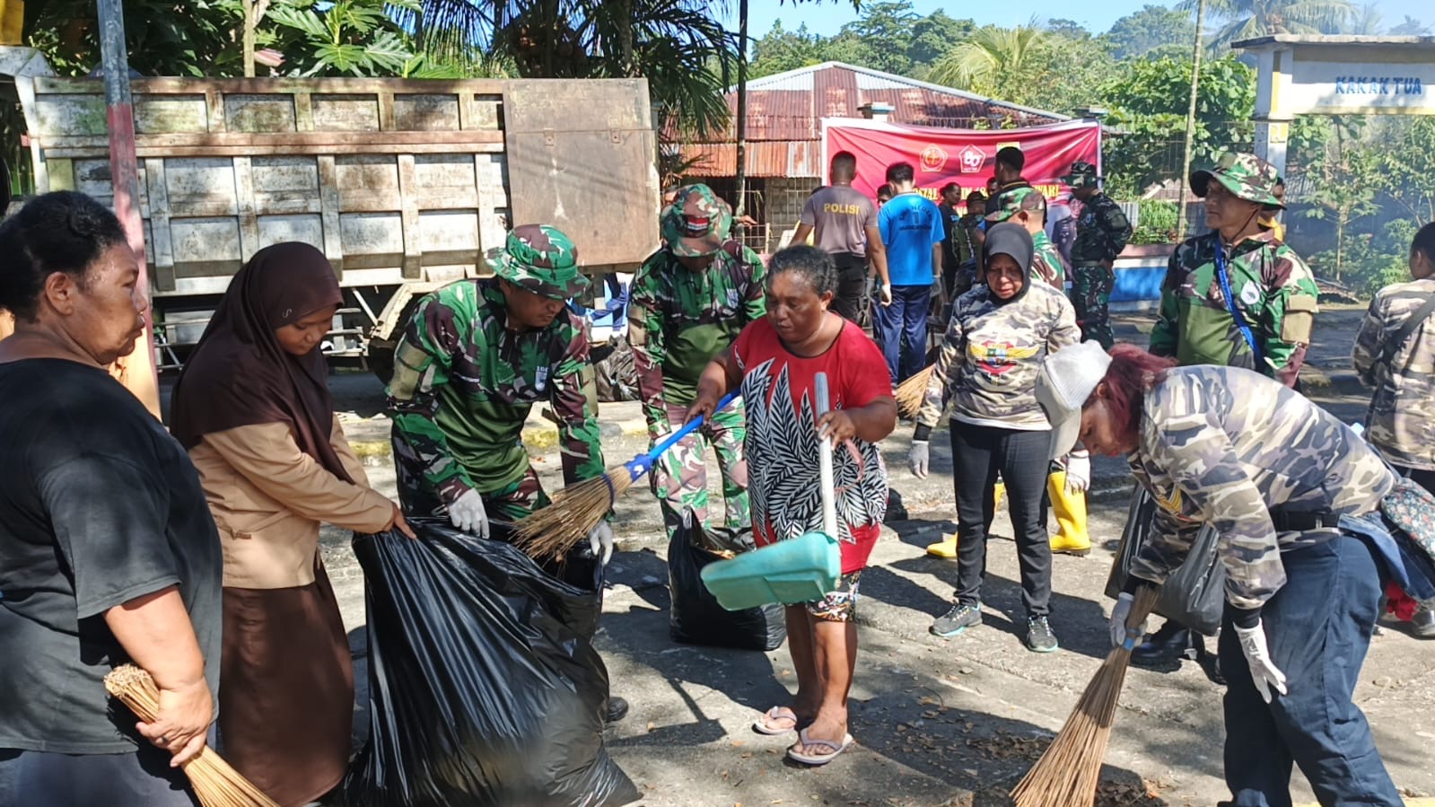 Maria Awom, tokoh perempuan setempat, mengungkapkan apresiasi dan rasa harunya atas keterlibatan TNI dalam menjaga kebersihan lingkungan.