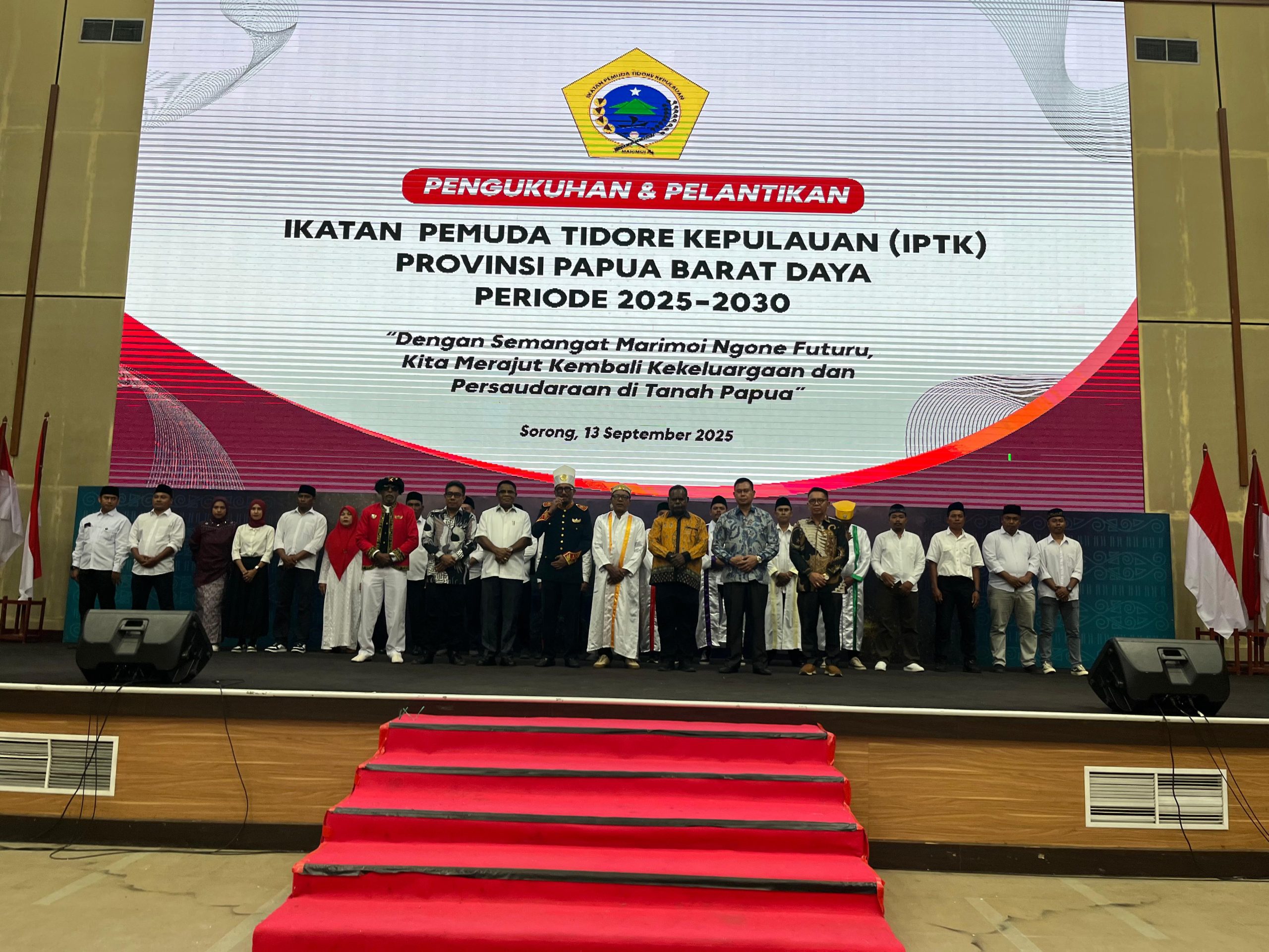 Kota Sorong Papua Barat Daya — Suasana penuh semangat dan persaudaraan menyelimuti Gedung Lambert Jitmau Kota Sorong, Papua Barat Daya, saat pelantikan dan pengukuhan Pengurus Ikatan Pemuda Tidore Kepulauan (IPTK) Provinsi Papua Barat Daya periode 2025–2030 resmi dilaksanakan pada Sabtu (13/9/2025)