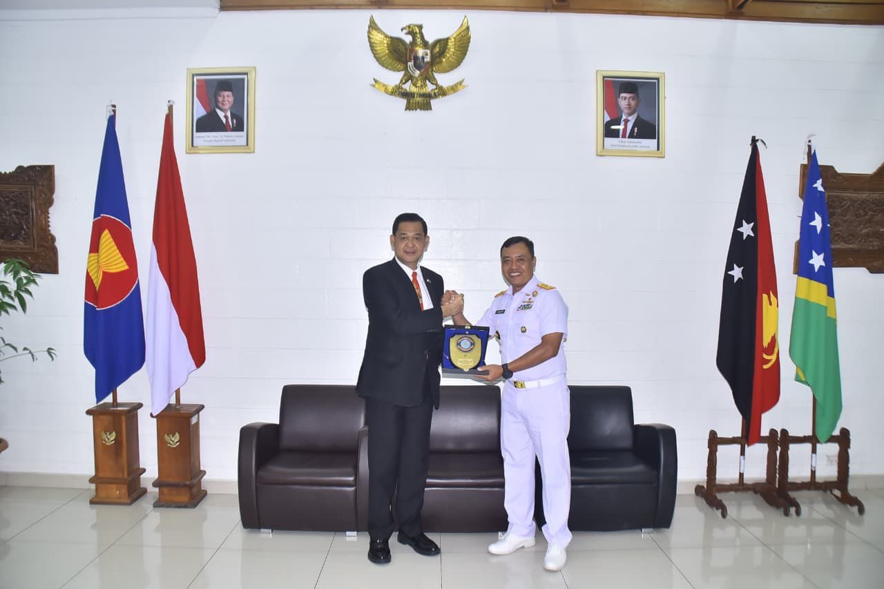 Papua New Guinea Port Moresby — (Satuan Tugas (Satgas) Port Visit TNI Angkatan Laut tiba di Port Moresby, Papua New Guinea (PNG) dan mendapat sambutan langsung dari Duta Besar Republik Indonesia untuk Papua New Guinea, Bapak Andriana Supandi, bersama jajaran staf KBRI Port Moresby di Dermaga Lama T-Wharf, Minggu (14/9/2025.