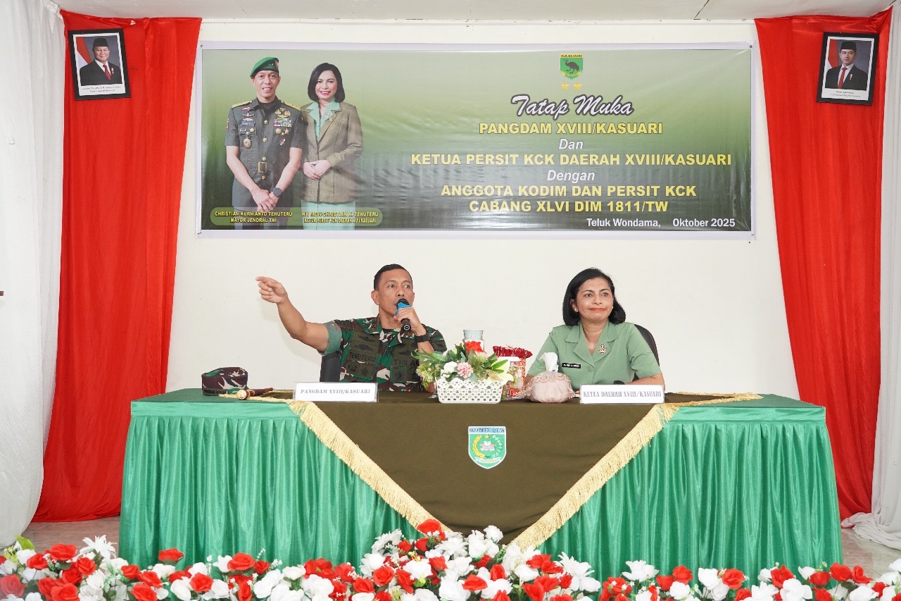 Wasior Papua Barat – Pangdam XVIII/Kasuari, Mayjen TNI Christian Kurnianto Tehuteru, didampingi Ketua Persit KCK Daerah XVIII/Kasuari, Ny. Mevi Christian K. Tehuteru melaksanakan kunjungan kerja sekaligus meninjau langsung kondisi satuan serta memberikan arahan, motivasi dan dorongan semangat kepada para prajurit serta keluarga besar Kodim 1811/Teluk Wondama, pada Jumat (24/10/2025).