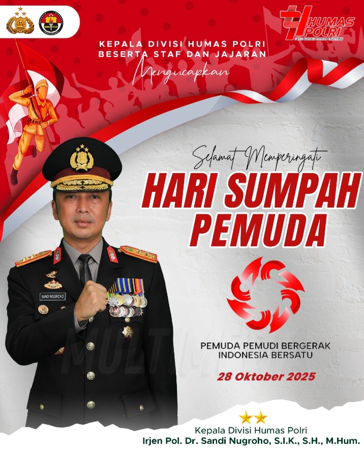 SUARARAKYAT.info||Jakarta-Dalam momentum peringatan Hari Sumpah Pemuda ke-97, Kepala Divisi Humas Polri, Irjen Pol. Dr. Sandi Nugroho, S.I.K., S.H., M.Hum., menyampaikan pesan penuh semangat kepada seluruh elemen bangsa, khususnya generasi muda Indonesia. Melalui pernyataannya, Irjen Sandi mengajak seluruh pemuda untuk terus mengobarkan semangat persatuan dan berkontribusi nyata dalam membangun Indonesia yang lebih maju, mandiri, dan berkeadilan.