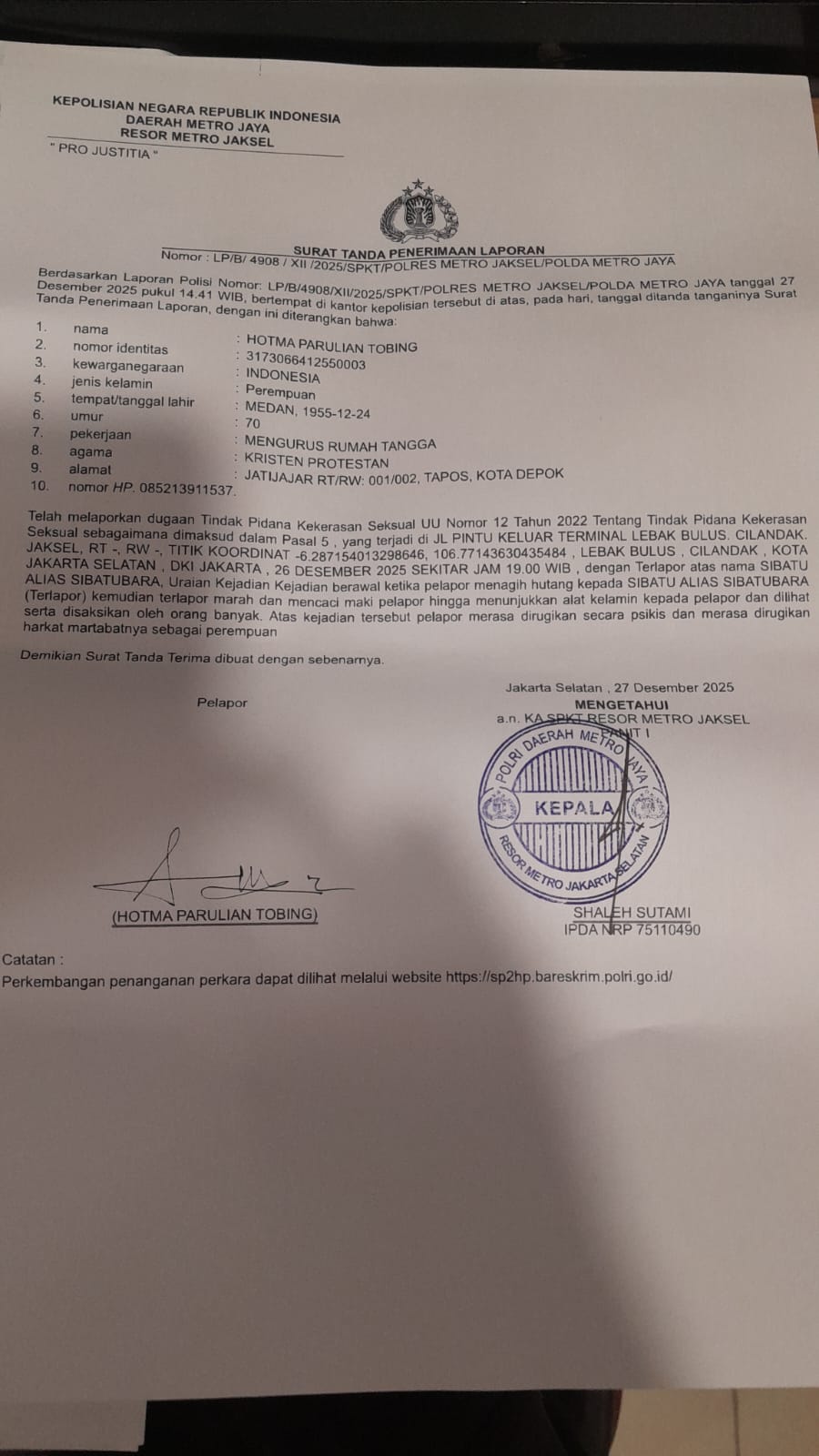 Kasus tersebut telah resmi dilaporkan ke pihak kepolisian dan tercatat dalam Laporan Polisi Nomor: LP/B/4908/XII/2025/SPKT/POLRES METRO JAKSEL/PMJ, tertanggal 27 Desember 2025, dan kini ditangani oleh Unit PPA (Perlindungan Perempuan dan Anak) Polres Metro Jakarta Selatan.