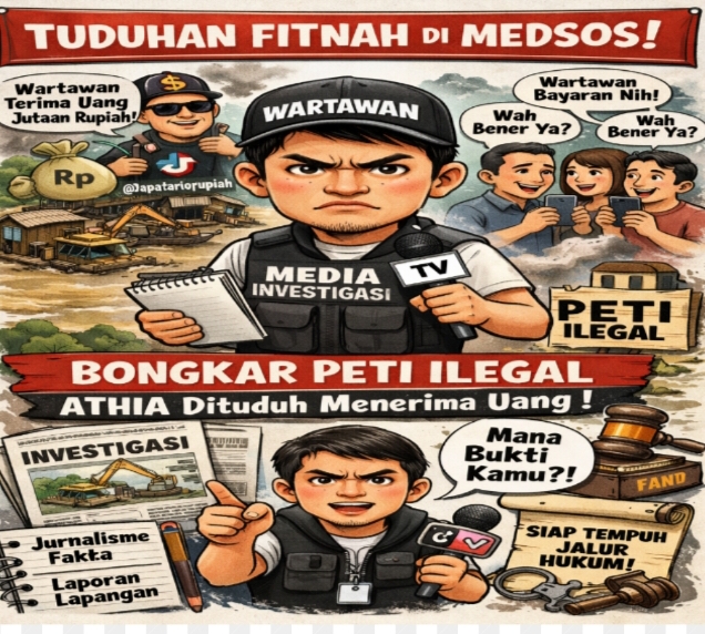 SUARARAKYAT.info|| Kuantan Singingi, Riau — Seorang wartawan investigasi bernama Athia, yang juga dikenal sebagai Direktur Media IntelijenJendral.com serta pemilik akun TikTok @athia.tim.investigasi, diduga menjadi korban pencemaran nama baik di media sosial. Tuduhan tersebut datang dari akun TikTok @romariorupiah, yang menuding Athia menerima uang jutaan rupiah setelah mempublikasikan pemberitaan terkait aktivitas Pertambangan Emas Tanpa Izin (PETI) di wilayah hukum Polsek Benai, Kabupaten Kuantan Singingi, Provinsi Riau.jumat (16/1/2026)