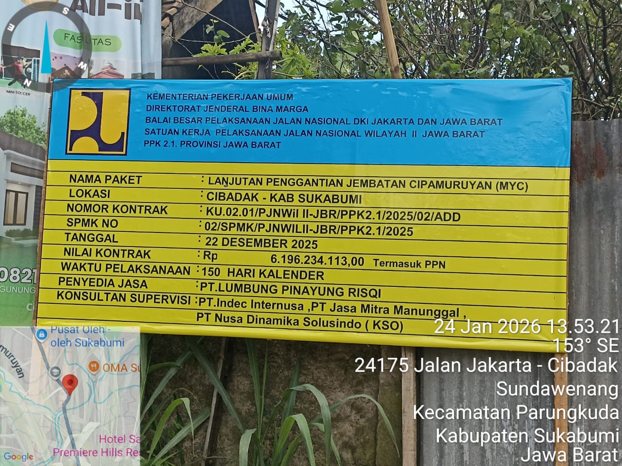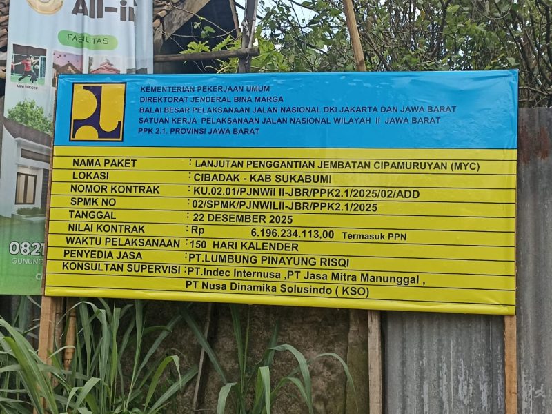 SUARARAKYAT.info||SUKABUMI-Pengerjaan lanjutan pembangunan Jembatan Cipamuruyan di Kecamatan Cibadak, Kabupaten Sukabumi Senilai lebih kurang 6.1 miliar dengan nomor kontrak KU. 02.01/PJNWil 2.Jabar PPK 2.1/2025/02/Add kembali menjadi perhatian publik. Minggu (25/1/2026)