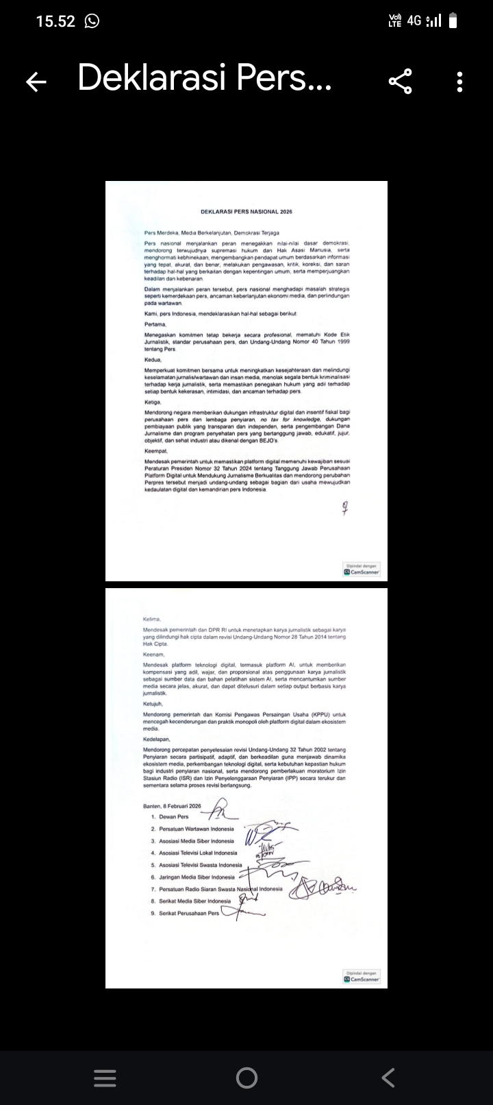 Pers nasional juga menyoroti peran dominan platform digital dalam distribusi informasi dan pendapatan iklan. Deklarasi ini mendukung implementasi Peraturan Presiden Nomor 32 Tahun 2024 tentang Tanggung Jawab Perusahaan Platform Digital untuk Mendukung Jurnalisme Berkualitas dan Berkelanjutan.