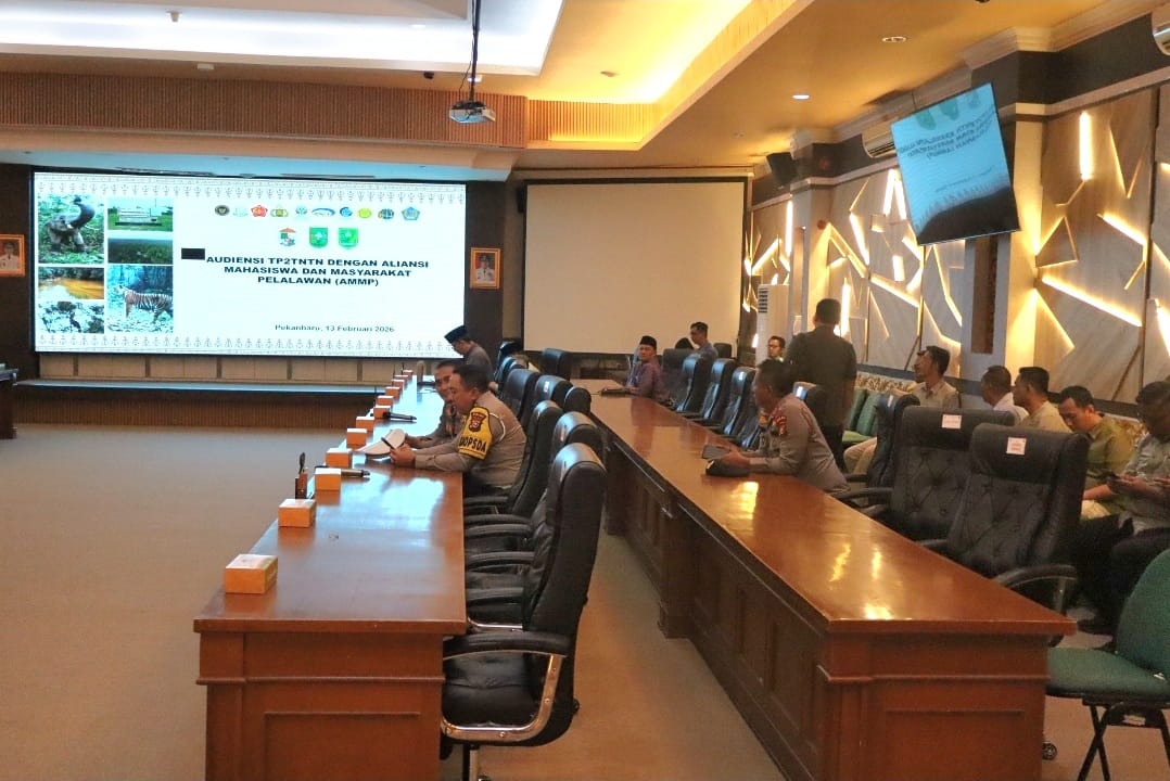 SUARARAKYAT.info|| PEKANBARU Bertempat di Ruang Melati Kantor Gubernur Riau, Jalan Jenderal Sudirman, Pekanbaru, telah dilaksanakan audiensi antara Tim Percepatan Penanganan Taman Nasional Tesso Nilo (TP2TNTN) dan Aliansi Mahasiswa serta Masyarakat Pelalawan (AMMP). Kegiatan ini dihadiri sekitar 50 undangan yang terdiri dari unsur Pemerintah Provinsi Riau, TNI, Polri, instansi teknis terkait, serta perwakilan masyarakat dari sejumlah desa di sekitar Jumat 13/2/26.