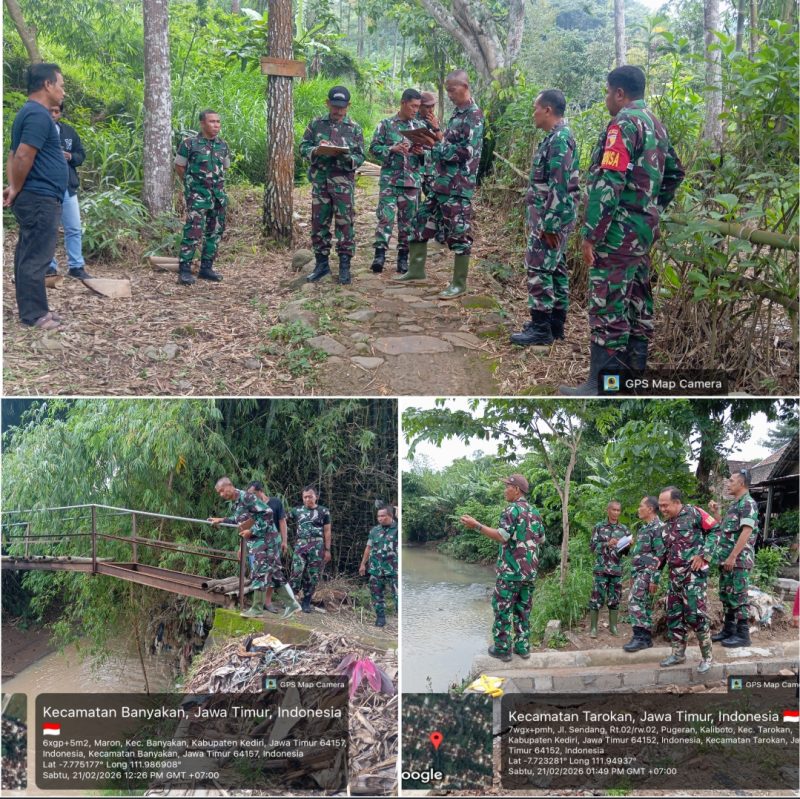 SUARARAKYAT.info|| KEDIRI – Dalam upaya memastikan keamanan infrastruktur dan meningkatkan konektivitas antar wilayah,Koramil 0809 – 05 Grogol Kediri melaksanakan peninjauan langsung dan survei teknis pada jembatan gantung di desa maron,desa parang,kecamatan banyakan,serta desa kaliboto,kecamatan tarokan Kediri,(22/02/2026).
