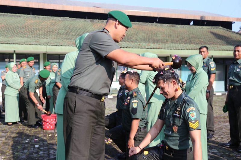 Setelah prosesi penyematan tanda pangkat selesai, kegiatan dilanjutkan dengan tradisi siraman air kembang oleh Dandim kepada seluruh personel yang naik pangkat. Tradisi ini memiliki makna mendalam sebagai simbol pembersihan diri, rasa syukur, serta harapan agar para prajurit semakin bijak, profesional, dan bertanggung jawab dalam mengemban amanah baru.