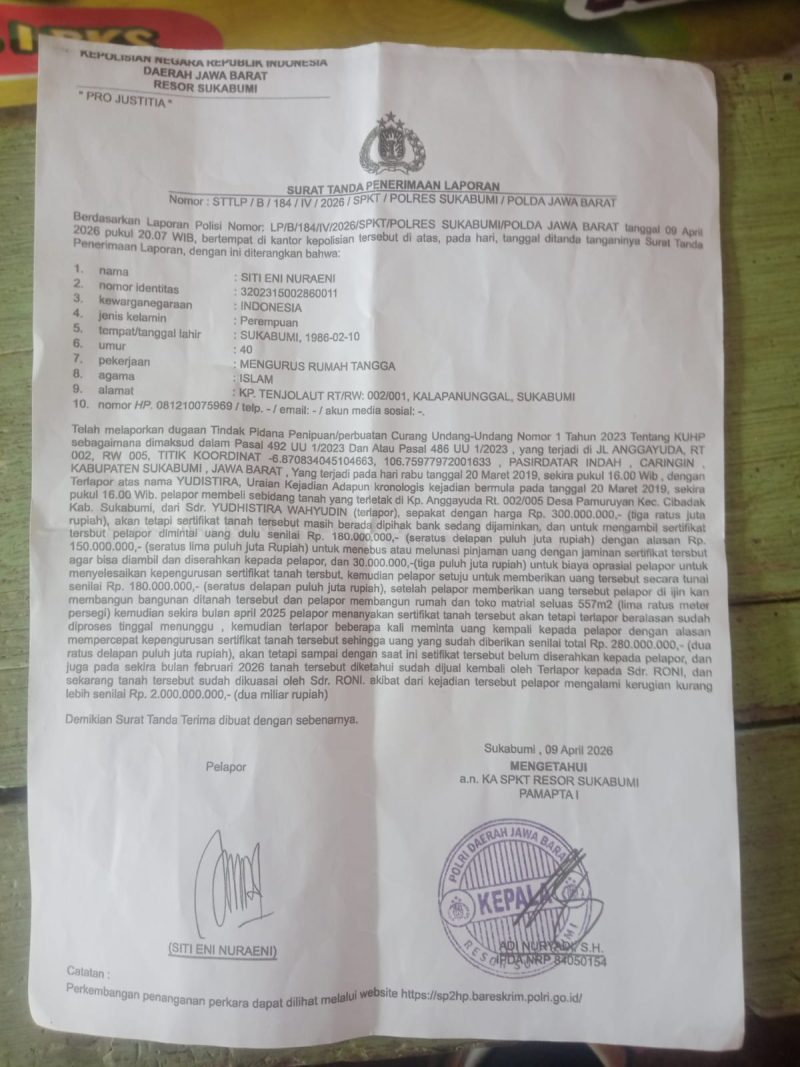 SUARARAKYAT.info || SUKABUMI — Dugaan praktik penipuan dalam transaksi jual beli tanah kembali mencuat di wilayah Angga Yuda, Desa Pamuruyan, Kecamatan Cibadak, Kabupaten Sukabumi. Kasus ini menyeruak ke publik setelah seorang warga bernama Siti Eni Nuraeni melayangkan laporan resmi ke pihak kepolisian, membuka tabir persoalan yang diduga telah berlangsung selama bertahun-tahun dengan berbagai kejanggalan.