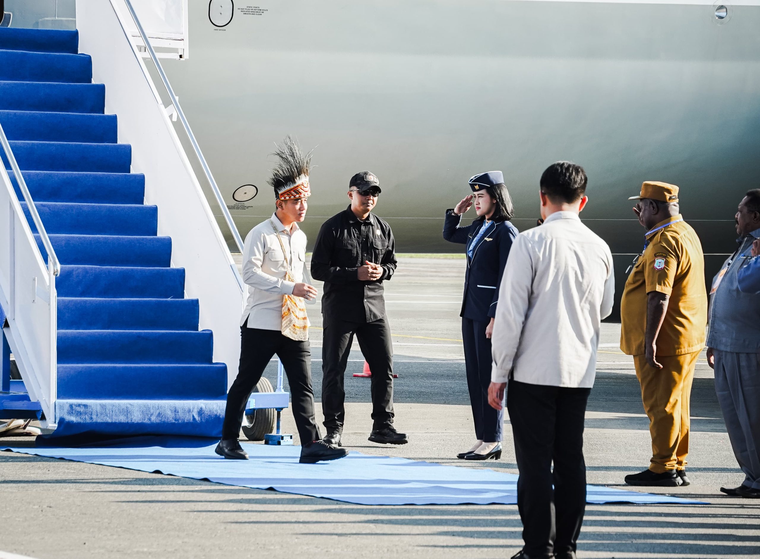 Saat tiba di Bandara Sorong, Wapres disambut oleh Gubernur Papua Barat Daya Elisa Kambu bersama jajaran Forum Koordinasi Pimpinan Daerah (Forkopimda) serta tokoh masyarakat, Selasa (21/4/2026)