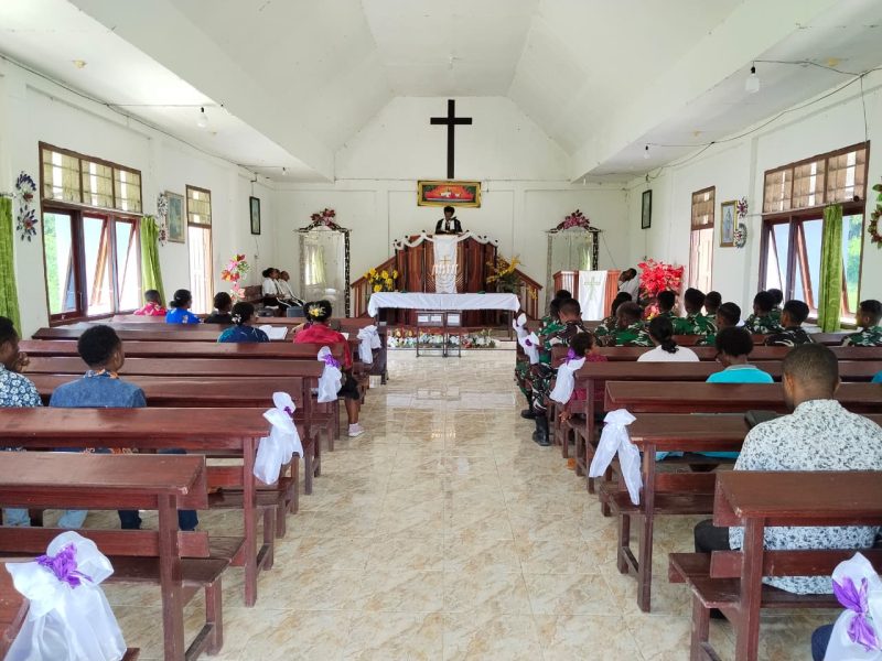Sebelum melanjutkan pekerjaan pada sasaran fisik, para personel menyempatkan diri melaksanakan ibadah Minggu bersama masyarakat di *Gereja Jemaat GKI Imanuel Asai*.