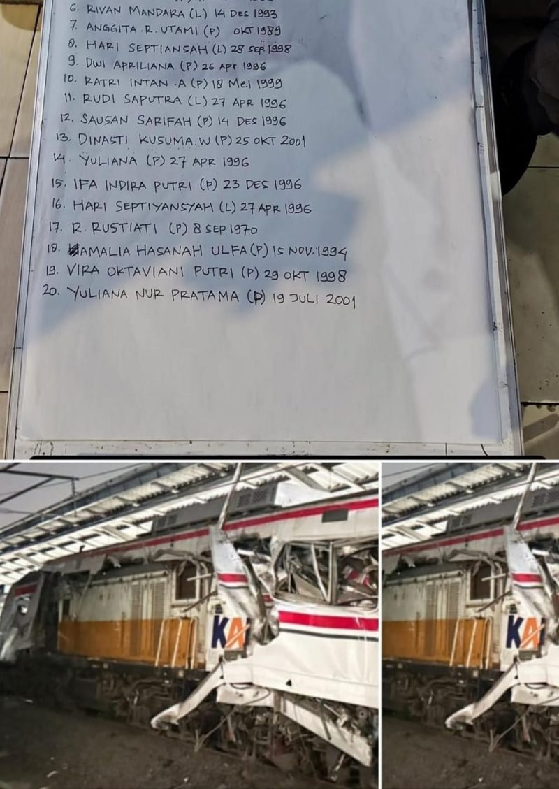 Dari data di atas, Kami masih menunggu data Resmi dari Pihak KAI Dan Kepolisian Polda Metro Jaya.