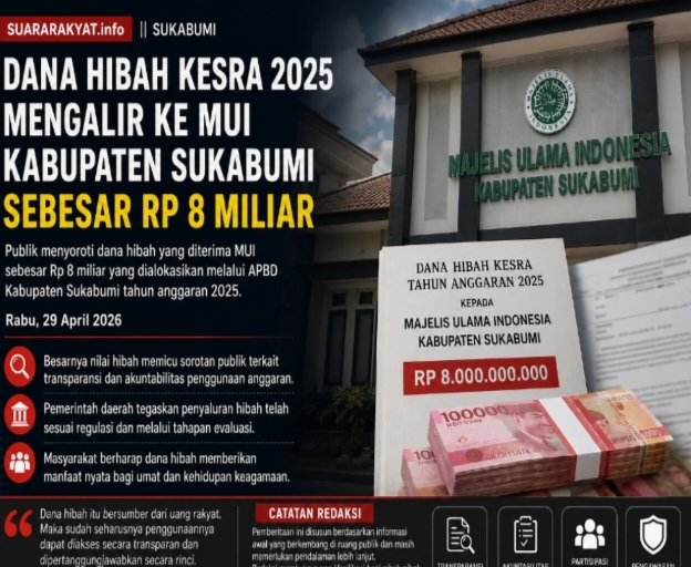 SUARAKYAT.info || SUKABUMI — Alokasi dana hibah Kesejahteraan Rakyat (Kesra) tahun anggaran 2025 di Kabupaten Sukabumi kembali menjadi perhatian publik. Hal ini menyusul adanya penyaluran anggaran sebesar Rp 8 miliar kepada Majelis Ulama Indonesia (MUI) Kabupaten Sukabumi yang kini menuai beragam tanggapan dari masyarakat dan kalangan pemerhati kebijakan publik. Rabu (29/4/2026).